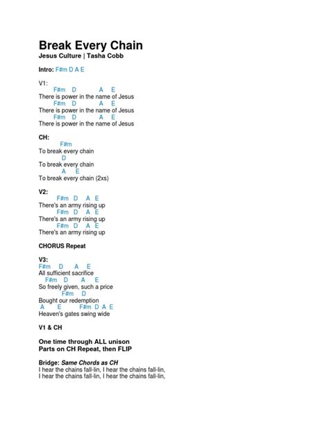 Once you have mastered the Break Every Chain chords, you can start to add variations to the song. For example, you can add a G7 chord or a D7 chord to give the song a different feel. This is a great way to practice your guitar skills and add some flair to the song. You can also add some strumming patterns or arpeggios to spice up the song even more. Experiment with different variations to find what sounds best to you.